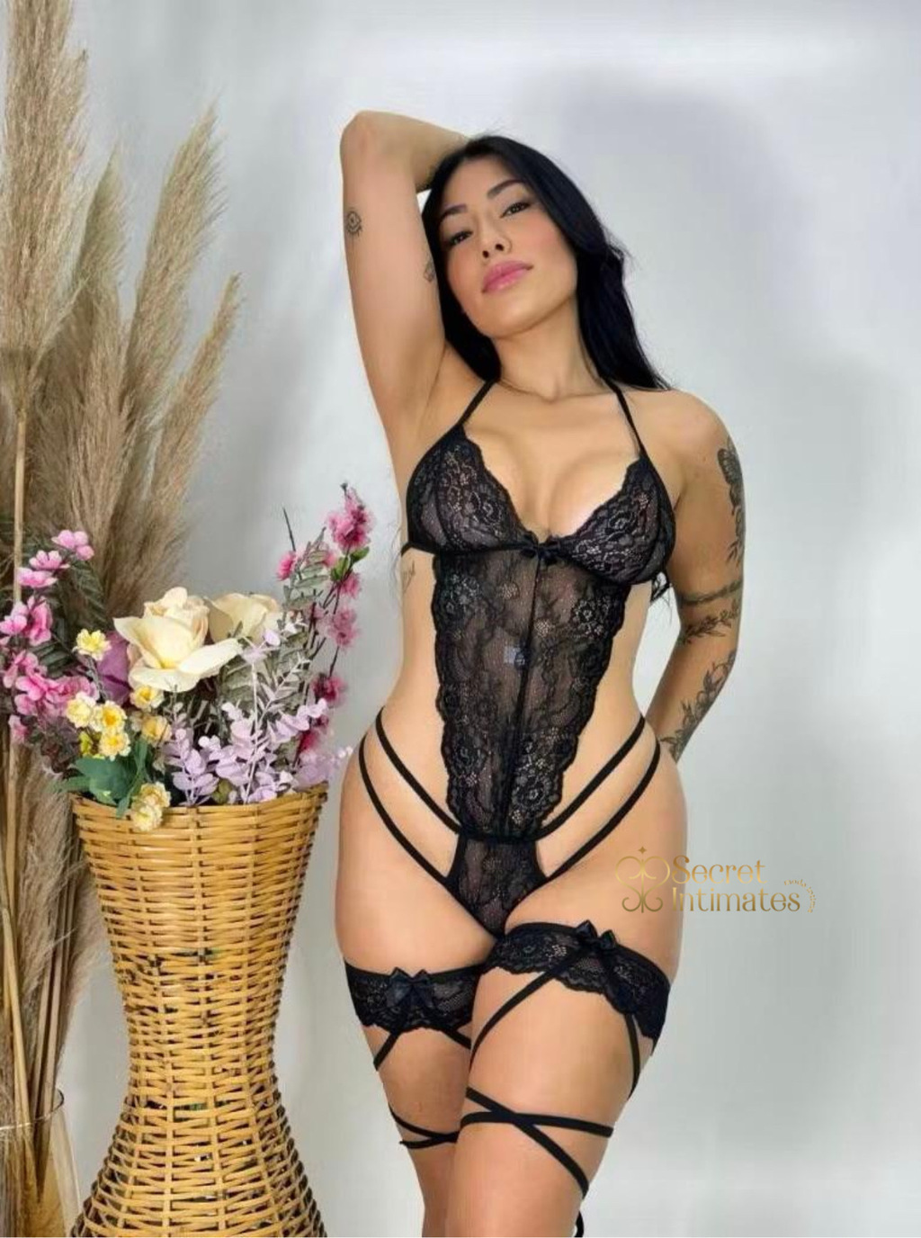 Descubra a combinação perfeita de ousadia e sofisticação com o Body Desejo. Feito em renda preta com recortes estratégicos e transparência delicada, ele valoriza suas curvas com charme e mistério. As ligas com laços e amarrações nas pernas adicionam um toque irresistível, ideal para você se sentir poderosa em qualquer momento especial. Seduza com elegância e confiança!